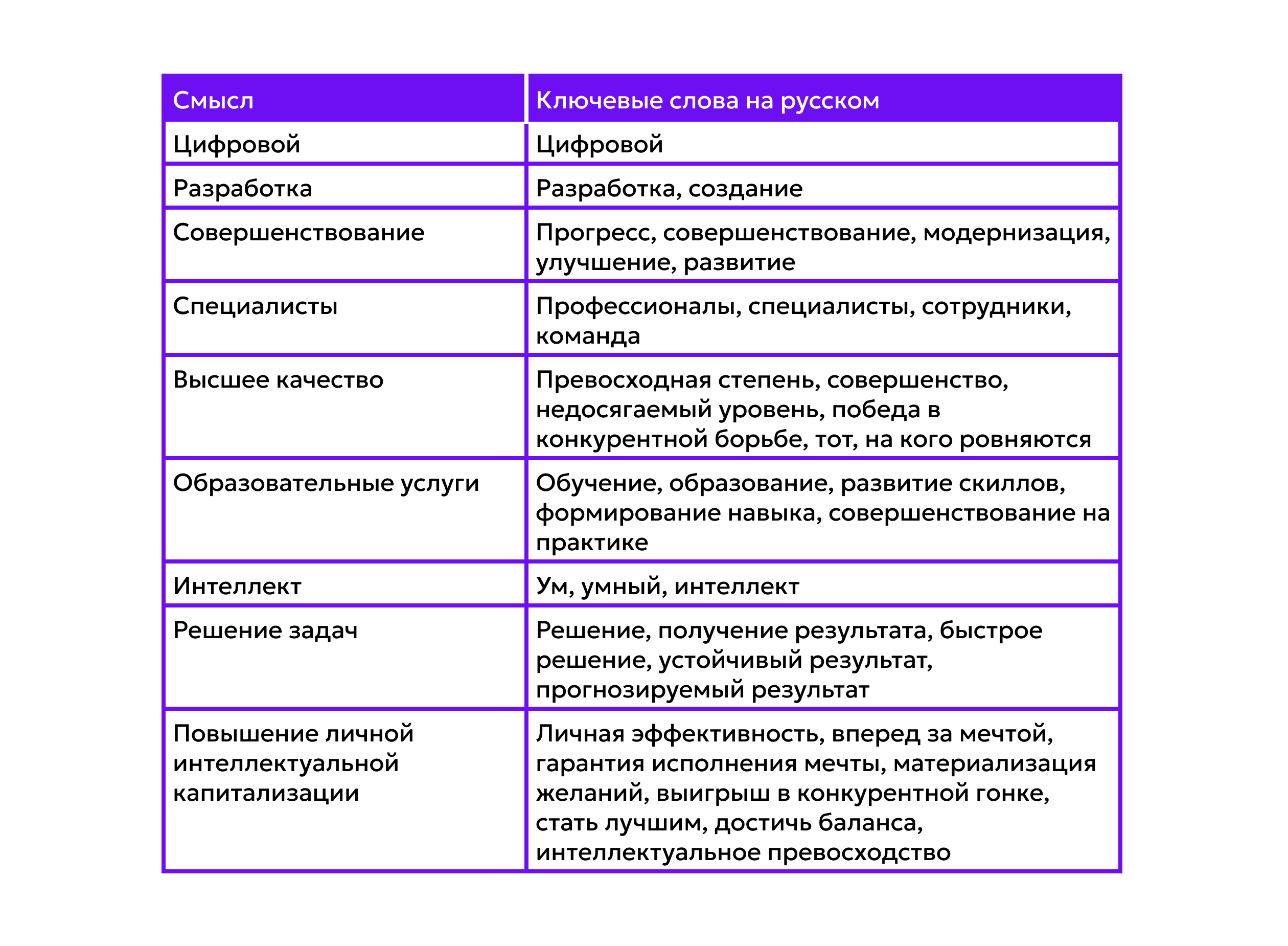 Далее были найдены наиболее интересные сочетания слов и фраз из правого столбца. В результате получилось вот такое многообразие вариантов: