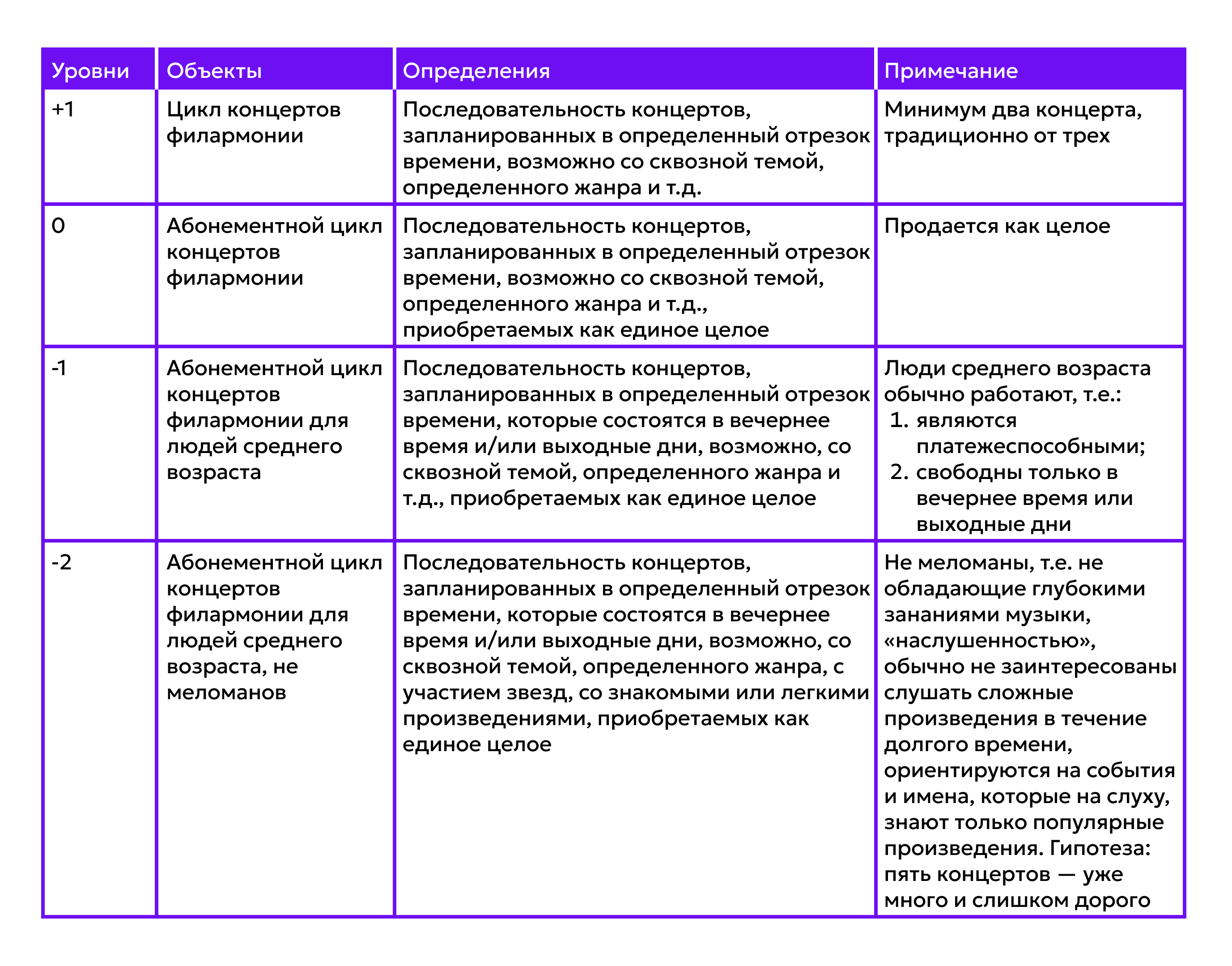 Таблица 7. Объекты и определения в комплексе обстоятельств: цикл концертов филармонии.