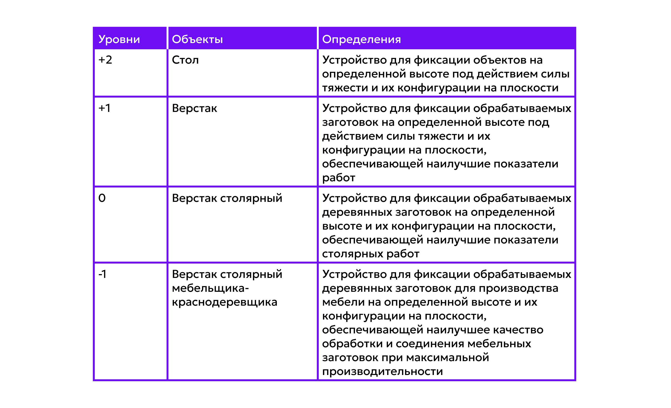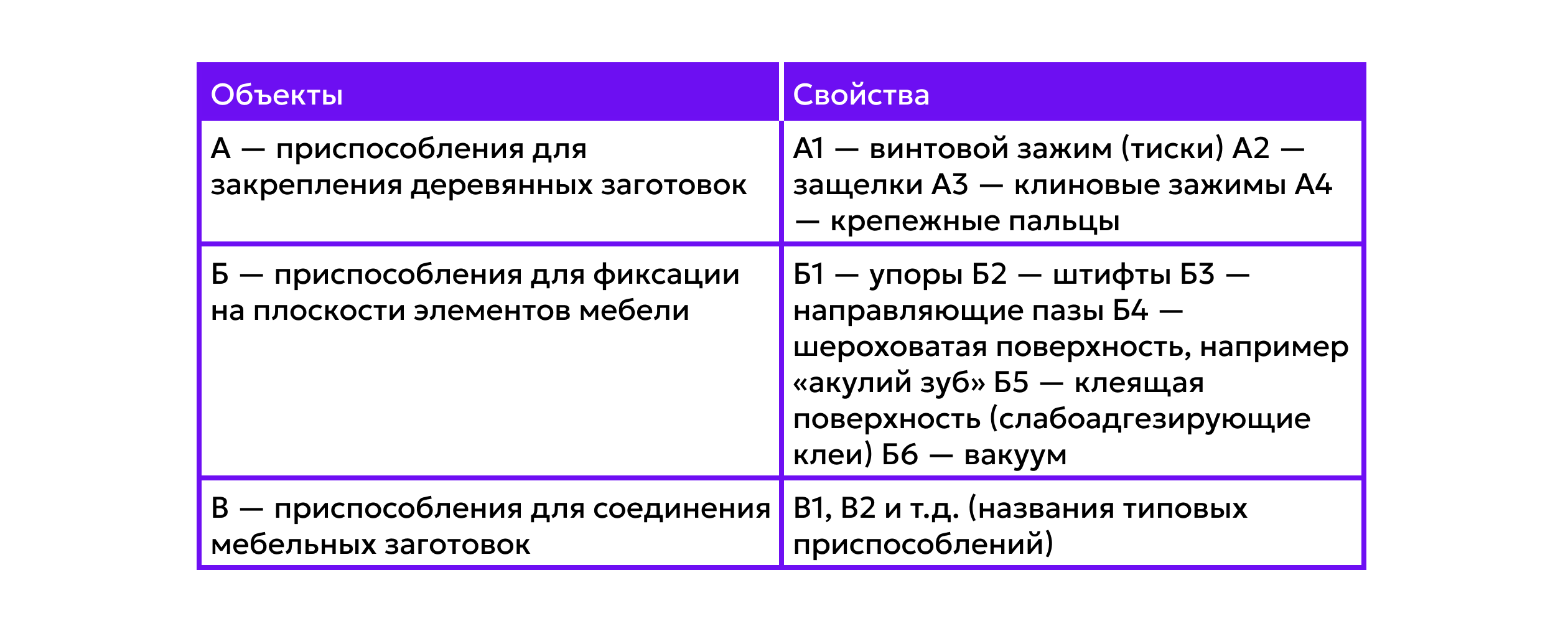 4. Анализируем, всё ли мы учли в поставленной задаче. Возможно, это столярный верстак для школьных уроков труда или какой-то иной? При углублении становится ясно, что это верстак мебельщика-краснодеревщика (табл. 3). Самый нижний, уточненный класс объектов, является целевым. С ним мы и будем работать дальше.
