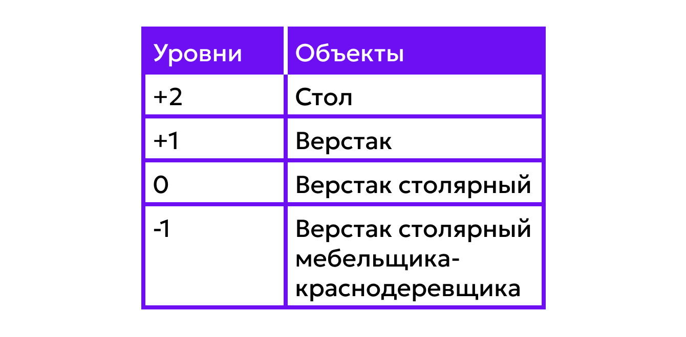 2. Двигаемся по уровням вверх, записывая вышестоящие классы объектов (столярный верстак входит в класс «верстаки», а верстак входит в класс «столы»). Двигаться далее не имеет смысла, т.к. мы выйдем за пределы интересующего нас объекта (табл. 2).