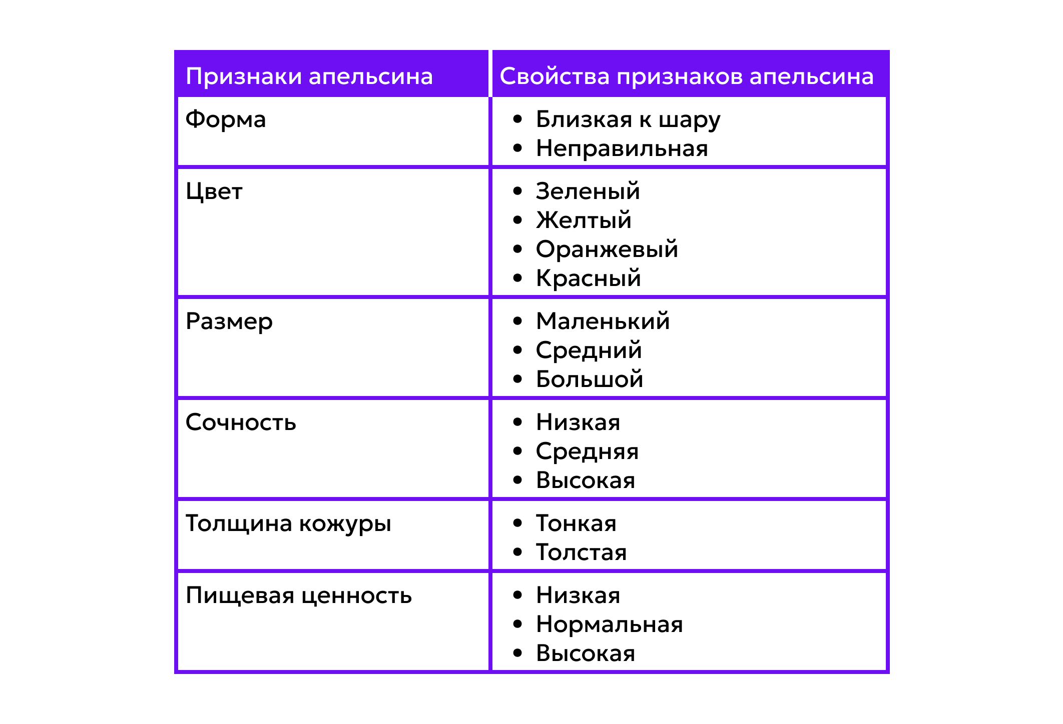 Например, возьмем объект «апельсин». У него много существенных признаков: форма, цвет, размер, сочность, толщина кожуры, пищевая ценность. Каждый из признаков можно разложить на свойства (табл. 1).